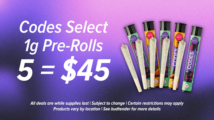Build your own 5-pack of Codes pre-rolls for just $45 from this select variety—mix, match, and save while supplies last! Select items only. Product varies by location. See budtender for details.