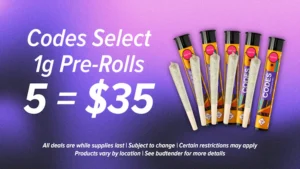 Stock up your stash with 5 Codes pre-rolls from this selection for just $35—your perfect mix, your perfect price! While supplies last. Select items only. Product varies by location. See budtender for details.