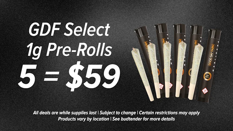 Go premium with top-shelf pre-rolls handpicked for true enthusiasts—just $59 for five! Experience bold flavor and potent effects. While supplies last! Select items only. Product varies by location. See budtender for details.