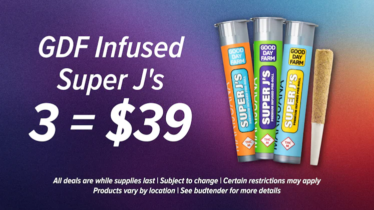 Roll into savings with three infused Super J’s for just $39! Perfectly packed for a smooth, flavorful experience. While supplies last! Select items only. Product varies by location. See budtender for details.